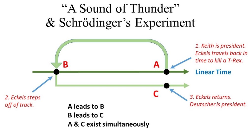 But things are not that simple. Eckels has a memory of Keith being elected, so therefore Keith, in some other time and space, was elected. Eckels, it turns out, did not return to his universe, but one that is parallel to his. In this case, his original universe (where Keith is president), and the universe he is in now (where Deutscher is president) exist simultaneously. Similar details in Bradbury’s story imply that on other trips with Time Safari Inc. the natural timeline has been disrupted, creating many other universes parallel to the original.