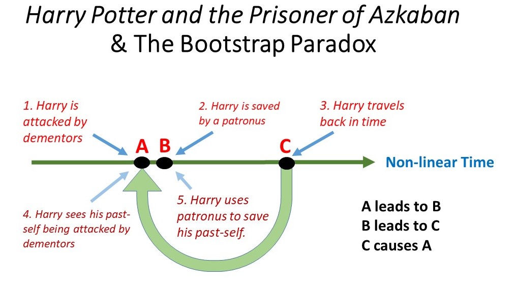 The Bootstrap Paradox presents itself in novels like Harry Potter and The Prisoner of Azkaban. During the narrative, Harry is attacked by dementors, but he is saved just in time by a patronus. Later in the text, Harry and Hermione travel back in time to the point when Harry is attacked. Together they watch the event unfold from a distance. The audience knows someone will eventually save Harry, since we watched him survive the dementors in the past. That someone turns out to be Harry himself, when he releases his own patronus. A cause in the future created an effect in the past.